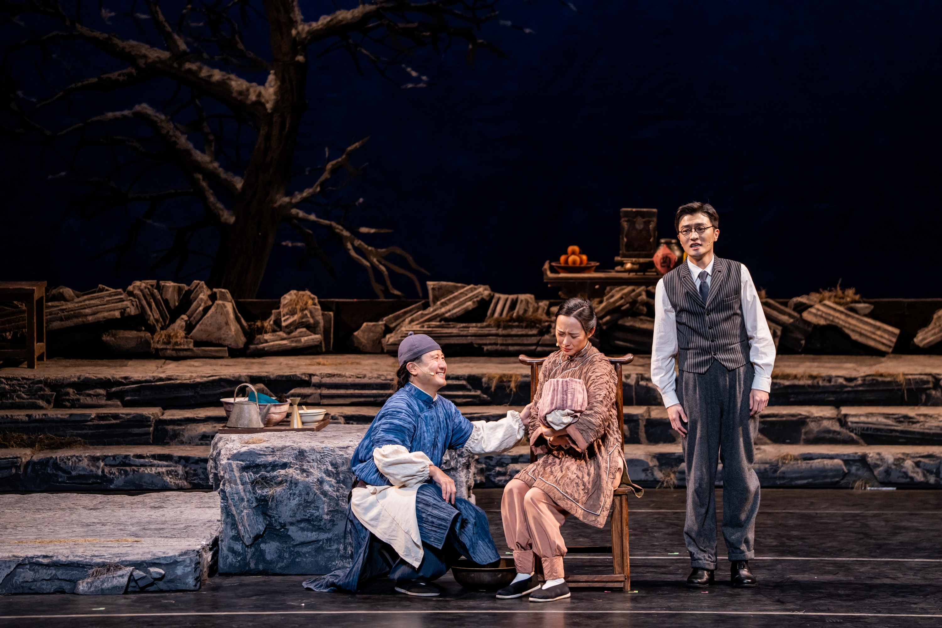 除了此之外,舞台地面也由从前的雪地酿成为了石板地。石板抽象参考了“圆明园”的石头形制,隐喻着“石头很顽强,尽管被摧残过,可是它依然在,而且会不断存不才去”。台前多少多盆老舍学生最爱的菊花,也仍是开患上发达。